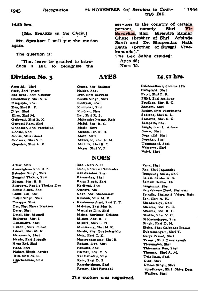 വീരസവർക്കർക്ക് വേണ്ടി പാർലമെന്റിൽ വോട്ടു ചെയ്ത എംപിമാർ