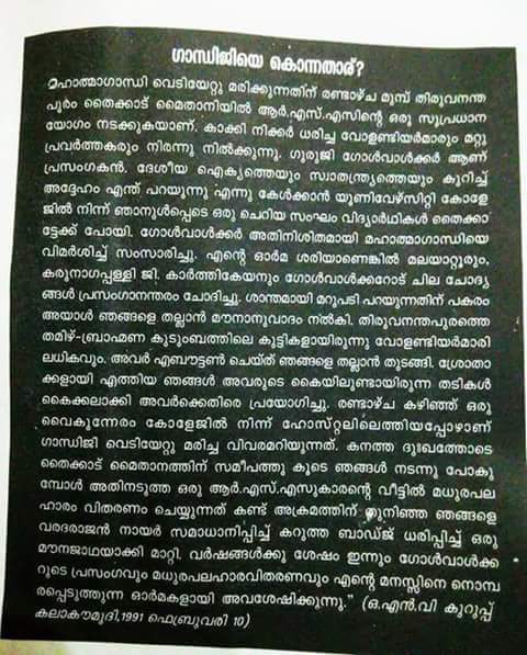 “ഗാന്ധിജി വെടിയേറ്റ് മരിക്കുന്നതിന് രണ്ടാഴ്ച മുൻപ് തിരുവനന്തപുരം തൈക്കാട് മൈതാനിയിൽ ആർഎസ്എസിന്റെ ന്റെ ഒരു സുപ്രധാന യോഗം നടക്കുന്നു. കാക്കി നിക്കർ ധരിച്ച വോളണ്ടിയർ മാരും മറ്റു പ്രവർത്തകരും നിരന്നു നിൽക്കുന്നു. ഗുരുജി ഗോൾവാൾക്കർ ആണ് പ്രസംഗകൻ. ദേശീയ ഐക്യത്തേയും സ്വാതന്ത്ര്യത്തേയും കുറിച്ച് അദ്ദേഹം എന്ത് പറയുന്നു എന്ന് കേൾക്കാൻ യൂണിവേഴ്സിറ്റി കോളേജിൽ നിന്ന് ഞാനുൾപ്പെടെ ഒരു ചെറിയ സംഘം വിദ്യാർത്ഥികൾ തൈക്കാട്ടേക്ക് പോയി.