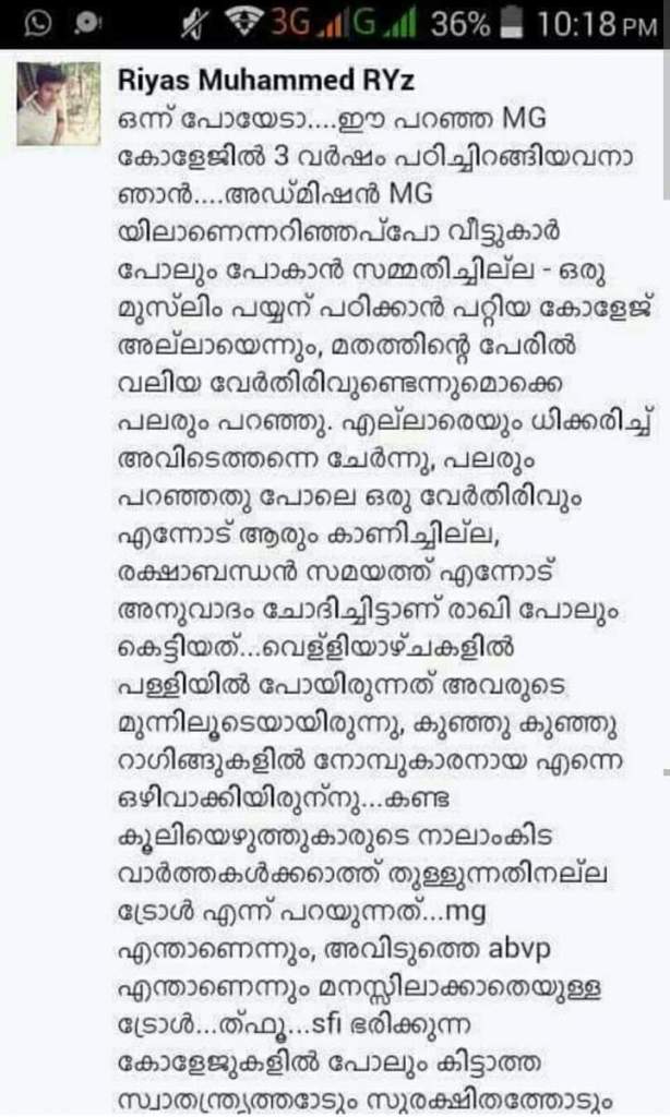 ഇന്നലെ ഞാനിത് പറഞ്ഞത് എസ്സിറ്റിയിലെ ABVP unit Vice President സദീദ് അമീനോടാണ്. ഈ വർഷവും മുടങ്ങാതെ ഈ കള്ളക്കഥകളുമായി ആ രക്തതാരകം പതിച്ച കള്ളക്കൊടിയുമായി അവർ ക്ലാസ് മുറികൾ കയറിയിറങ്ങും. എന്നിട്ട് വെറുപ്പിന്റെ വിത്തുകൾ വിദ്യാർഥികളുടെ മനസ്സിലേയ്ക്കിടും. അതു കൊയ്ത് അവർ സംഘടയിലേയ്ക്ക് ആളെക്കൂട്ടും. Burden of proof ചോദിച്ചു ചെല്ലുന്നത് ഗ്രാസ് റൂട്ട് ലെവലിൽ എത്ര ഫലവത്താകാൻ. സത്യം ചെരുപ്പണിയുമ്പോഴേക്കും നുണ ലോകം ചുറ്റിക്കഴിഞ്ഞിരിക്കും എന്നല്ലേ.. Nation First എന്നു പഠിപ്പിക്കുന്ന വിദ്യാർത്ഥി പ്രസ്ഥാനത്തെ തടഞ്ഞു നിർത്താൻ മതത്തിന്റെ വിഷവിത്തുകൾ വിതയ്ക്കുന്ന ഇക്കൂട്ടരോട് എന്തു പറയാൻ.