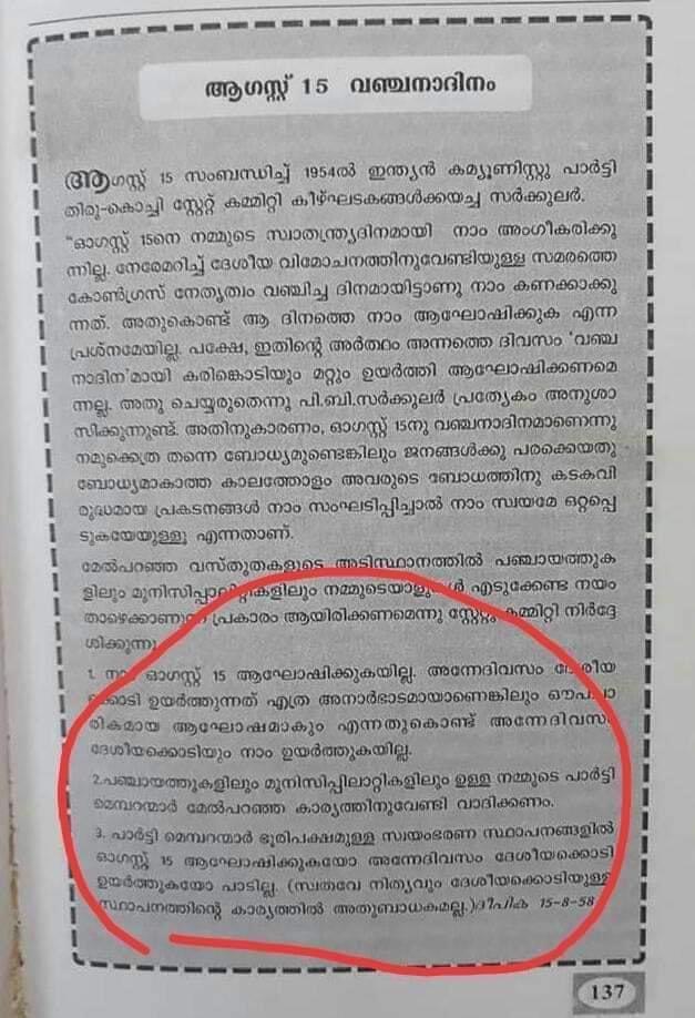 സിപിഎം അല്ലെങ്കിൽ സിപിഐ നമ്മുടെ സ്വാതന്ത്ര്യ ദിനം ആഘോഷിക്കുന്നത് അപമാനകരമാണ് എന്നു പറയുന്നത് ഒരു രാഷ്ട്രീയ ആരോപണം ഒന്നുമല്ല. അത് മൂന്ന്.. അല്ല, നാല് കാരണങ്ങളാലാണ്.